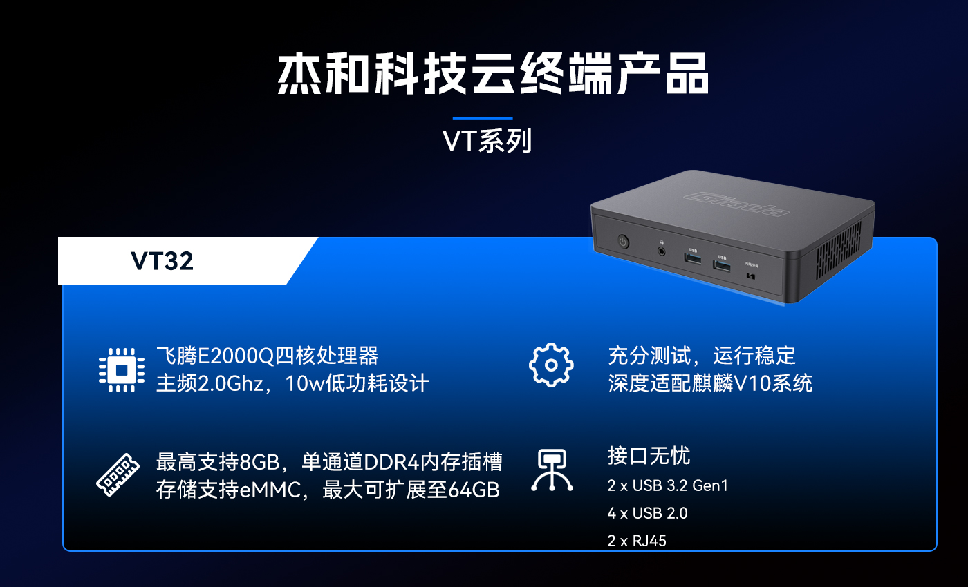 为响应信创趋势,米兰体育科技推出了搭载国产芯片—飞腾E2000Q的云终端VT32,VT32与麒麟V10操作系统进行了深度适配,为用户打造出更加安全可信的解决方案。