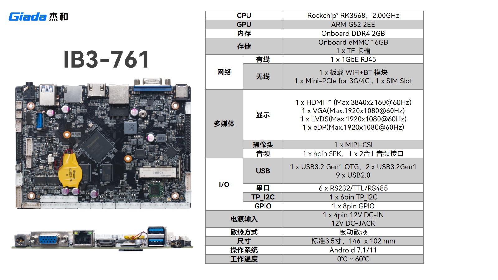 IB3-721同样采用 RK3288 处理器,通过精简接口进一步控制成本:保留 1GbE RJ45 网口,删减 RJ12 ,USB 减至 5 个、TTL 串口减为 3 个 ,在满足基础商显交互(如零售机、查询机)同时,降低成本,适配功能聚焦、对成本敏感场景 。