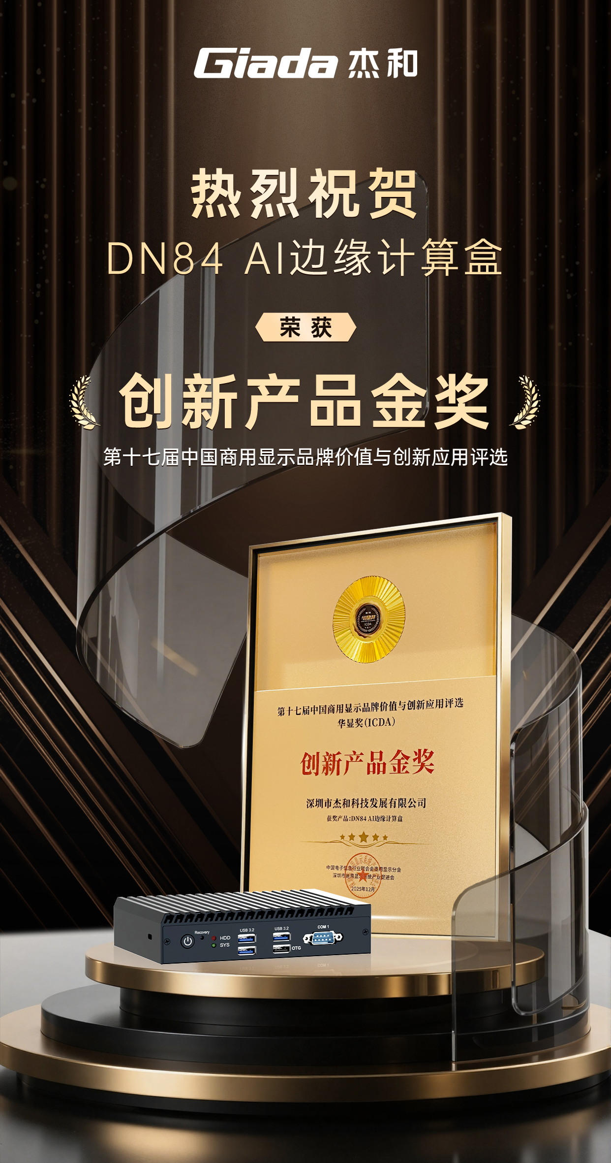 在备受瞩目的“ICDA华显奖”颁奖盛典上,米兰体育科技AI边缘计算盒DN84凭借其创新的边缘AI性能与设计,赢得了评委会的高度认可,成功斩获“创新产品奖”。