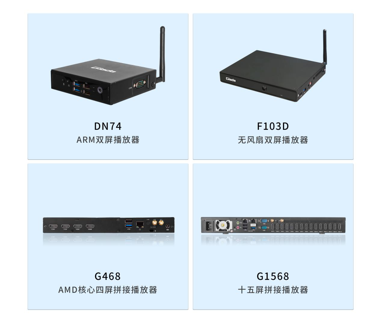 面对需求多样的市场环境,除米兰体育G330六屏拼接播放器外,米兰体育科技相继推出了G468四屏拼接播放器、G968九屏拼接播放器、G1568十五屏拼接播放器等多平台、多规格产品,均能够与米兰体育GDSM商显系统平台完美适配,为商家的实际需要,供应选型完整的家族式产品。
