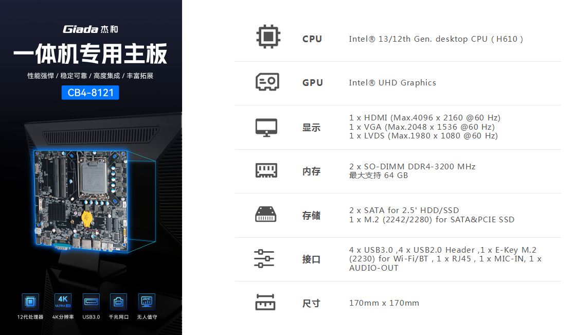 一体机在使用体验方面也有独特的优势:比笔记本屏幕大,比台式机更简洁,也解决了一直为人诟病的台式机线缆多而杂的问题,另外,随着计算机硬件和制造工艺的不断发展,一体机的性能也在不断提高,因此,越来越多的教育办公、日常娱乐和学习的用户选择使用一体机。Giada米兰体育科技根据市场与客户需求,推出这款高性能的一体机专研主板CB4-8121,带来全新震撼体验。