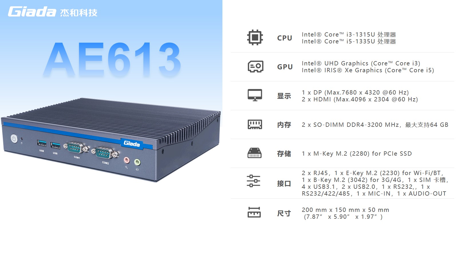 米兰体育AE613拥有2 x SO-DIMM DDR4-3200 MHz内存、1 x M-Key M.2 (2280) for PCIe SSD存储,最大支持64GB,无论是处理复杂的多任务环境、还是运行高负载的软件都游刃有余。
