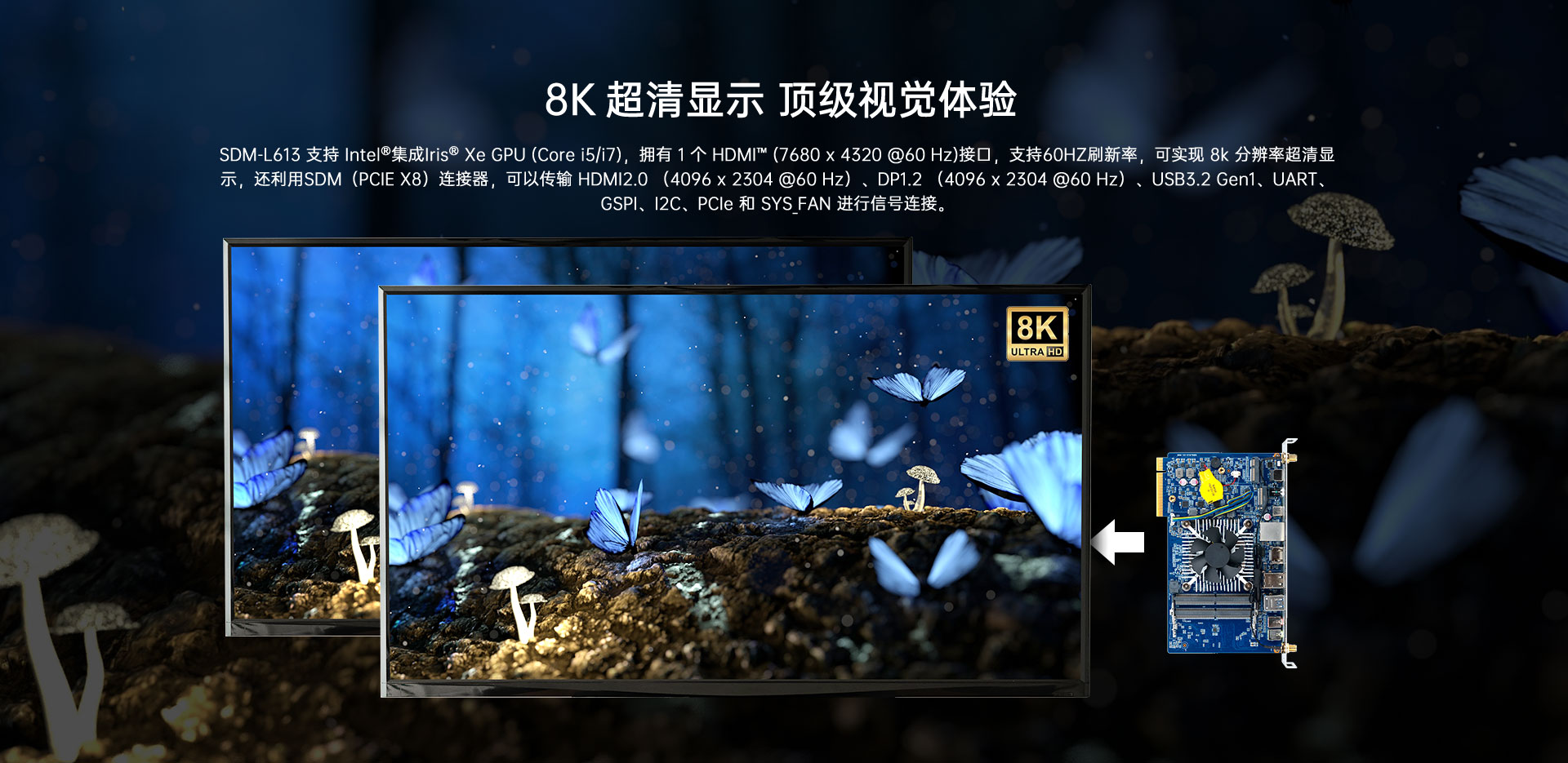 1个HDMI ™(7680 x 4320 @60 Hz)显示,PCIE x8 Edge Connector支持8K输出,1个HDMI ™(Max. 4096×2160@60Hz)1 x DP(Max.4096×2160@60Hz)