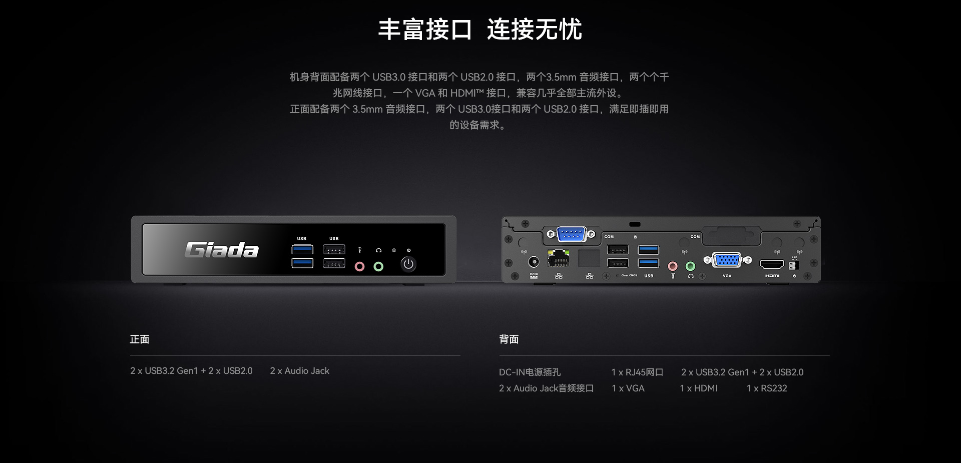支持1 x VGA(DP可选), 1 x HDMI显示,支持4K@60Hz视频输出